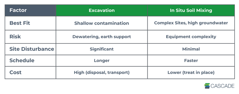 Selecting the right construction method is rarely a simple choice. Both excavation and in situ soil mixing can deliver effective PRBs and barrier walls, but their performance, cost drivers, and logistical demands differ in important ways. The table below highlights the key distinctions side by side, giving you a quick way to evaluate which approach aligns best with your site conditions, regulatory expectations, and project constraints.